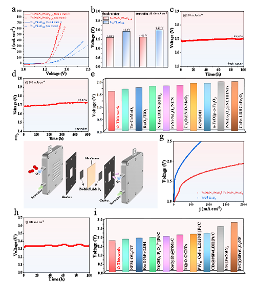 图7. (a) Fe-MoNi4/MoO2(‑,+)与Pt(‑)//RuO2(+)在碱性淡水和海水中的极化曲线. (b)分别在碱性淡水和海水中,组装电解池在100 mA·cm–2电流密度下的槽压. (c-d) Fe-MoNi4/MoO2(‑,+) 在(c)碱性淡水和(d)碱性海水中的稳定性测试. (e) 电解槽对比. (f) MEA器件结构示意图. (g) Fe-MoNi4/MoO2(‑,+)与Pt(‑)//RuO2(+)在碱性海水中的MEA极化曲线. (h) Fe-MoNi4/MoO2(‑,+)在MEA体系、海水介质中100 mA·cm–2下的稳定性测试. (i) 1000 mA·cm–2电流密度下,本工作与文献MEA体系的槽压对比.