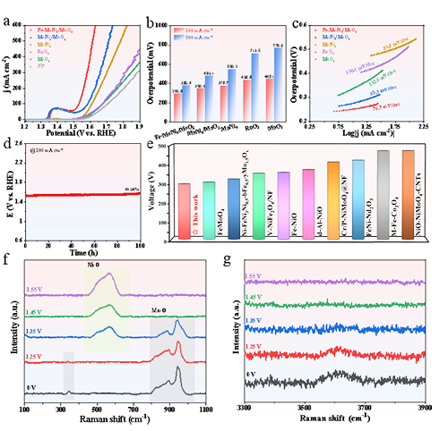 图5. Fe-MoNi4/MoO2, MoNi4/MoO2, MoNi4, MoO2和RuO2的(a) OER反应LSV极化曲线, (b) 过电位对比图, (c) Tafel图. (d) Fe-MoNi4/MoO2的稳定性测试(100 mA·cm–2). (e) Fe-MoNi4/MoO2与先前报道的催化剂OER性能比较.(f-g)Fe-MoNi4/MoO2在0 V至1.55 V(vs. RHE)施加电势范围内的非原位拉曼光谱.