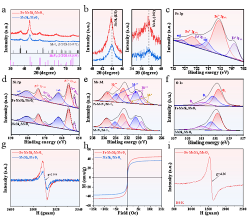 图2. (a-b) Fe-MoNi4/MoO2和MoNi4/MoO2的XRD谱图. (c-f) Fe-MoNi4/MoO2的高分辨率XPS谱图.(g) Fe-MoNi4/MoO2和MoNi4/MoO2的EPR谱图.(h) Fe-MoNi4/MoO2和MoNi4/MoO2的磁滞回线.(i) Fe-MoNi4/MoO2在100 k下的EPR谱图.