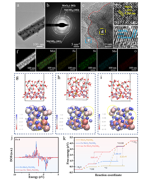 图6. OER反应后Fe-MoNi4/MoO2的(a) TEM图, (b) 选区电子衍射(SAED)图, (c–e) HRTEM图, (f) EDS元素分布图. (g) MoO2/Ni(OH)2,(h) Fe‑MoO2/Ni(OH)2, (i)含氧空位Fe‑MoO2/Ni(OH)2的结构模型与Bader电荷分析. (j) Fe的d轨道态密度计算. (k)三种催化剂表面的OER反应路径图.