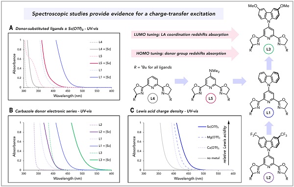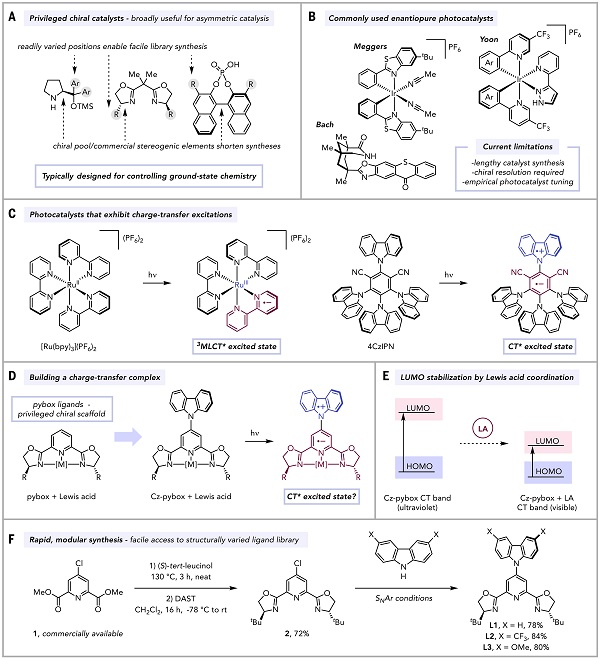 基于此,英国圣安德鲁斯大学Eli Zysman-Colman教授与美国威斯康星大学麦迪逊分校Tehshik P. Yoon教授联合在Science上发表了题为“Modular enantioselective photocatalysts from privileged pybox scaffolds”的论文,报道通过在优势吡啶双噁唑啉(Pybox)骨架的4位引入咔唑电子供体单元,设计并合成了一类模块化对映选择性光催化剂。该催化剂可从市售手性原料出发,经三步简洁合成,无需手性拆分。研究团队系统表征了其电荷转移(CT)光物理性质,证实通过调节咔唑取代基或配位路易斯酸,可分别精准调控HOMO与LUMO能级,从而优化氧化还原能力。在三个机制不同的模型反应中该催化剂均展现出高效的对映选择性控制能力,甚至能完成传统双催化体系无法实现的芳基底物转化。该工作验证了将光活性单元嵌入已知优势骨架以发展通用型手性光催化剂的可行策略。