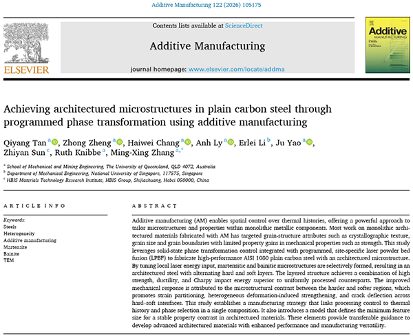 “Achieving architectured microstructures in plain carbon steel through programmed phase transformation using additive manufacturing”的最新研究成果。