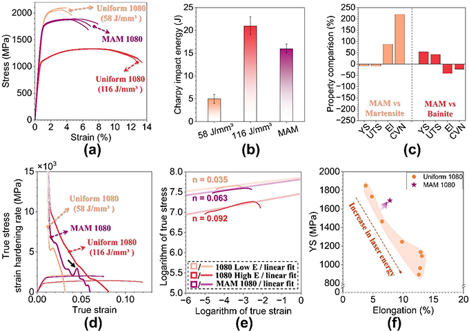 图3 | 力学性能: (a) 结构化1080钢(MAM 1080)以及采用两种选定激光能量输入(58 J/mm³ 和 116 J/mm³)均匀加工的1080钢的典型工程应力–应变曲线。(b) 这些钢材的夏比冲击能量。(c) 结构化1080钢与各均匀加工样品之间力学性能的定量比较。(d) 这些钢材的典型真实应力–应变曲线及对应的应变硬化速率随真实应变的变化,其中实心箭头表示结构化1080钢应变硬化曲线中的一个跃升阶段。(e) 这些钢材真实应力与真实应变的对数关系图,通过线性区段的斜率确定加工硬化指数(n)。(f) 阿什比图,对比结构化1080钢与不同激光能量输入(58、69、81、93、104、116、139 和 162 J/mm³)均匀加工的1080钢之间的力学性能。
