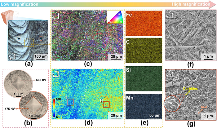 图2 | 结构化界面处的微观结构表征:(a) 0.6 mm 层状块体中两个结构化区域界面的截面光学显微图。(b) (a) 中标记区域压痕的放大图,显示不同结构化区域中压痕形貌的差异。(c) 对(a)中标记的结构化界面进行的纵向电子背散射衍射反极图(EBSD-IPF)映射。(d) 由(c)提取的晶粒平均带对比度(Band Contrast, BC)图,其中颜色标尺表示带对比度数值。(e) 主要元素(Fe、C、Si 和 Mn)的能量色散 X 射线谱(EDS)分布图。(f, g) (d) 中标记区域的高倍扫描电子显微镜(SEM)图像。图中的坐标系表示样品取向,其中 Z 轴为构建方向。