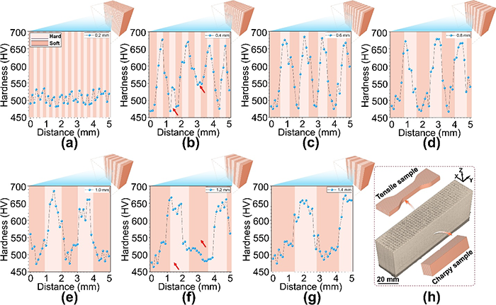 图1 | 层状异质结构硬度分布: 层状块体中两个结构化区域之间的截面硬度分布,其中结构特征厚度分别为 (a) 0.2 mm、(b) 0.4 mm、(c) 0.6 mm、(d) 0.8 mm、(e) 1.0 mm、(f) 1.2 mm 和 (g) 1.4 mm。(a) 中的彩色带表示设计的硬区与软区位置;(h) 为结构特征厚度为 0.6 mm 的棒状试样,用于拉伸与夏比冲击性能测试。