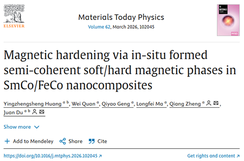 Yingzhengsheng Huang, Wei Quan, Qiyao Geng, Longfei Ma, Qiang Zheng*, Juan Du*, Magnetic hardening via in-situ formed semi-coherent soft/hard magnetic phases in SmCo/FeCo nanocomposites, Materials Today Physics, 62, 2026, 102045, https://doi.org/10.1016/j.mtphys.2026.102045