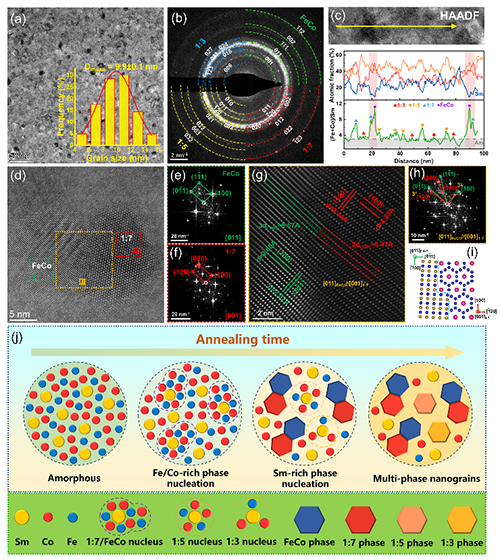 图3 磁体I微观结构的TEM结果:(a)明场像;(b)(a)图对应的SAED结果;(c)晶粒尺寸的统计结果;(d)HRTEM图像;(e、f、h)(d)中I、II、III区对应的FFT图像;(g)(d)中III区对应的IFFT图像;(i)Sm(Co,Fe)7和Fe(Co)之间的半共格界面示意图;(j)半共格软/硬磁相晶粒形核和生长过程示意图。