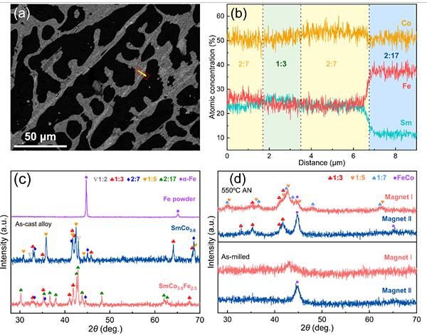 2. 工艺创新,界面调控:摒弃传统的“粉体混合-球磨”思路,创新性地采用预合金化Sm-Co-Fe铸锭进行球磨,获得完全非晶前驱体。通过后续受控晶化,成功驱动FeCo软磁相与SmCo硬磁相(主要为1:7相)同步形核、协同生长,最终原位形成两相直接接触的独特纳米复合结构。