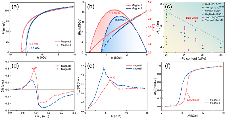 图4 磁体I和磁体II的磁性能:(a)退磁曲线;(B)BHi–H和B–H曲线;(c)本工作中制备的磁体I的矫顽力与文献中的SmCo/Fe(Co)纳米复合材料比较;(d)Henkel曲线;(e-f)可逆磁化强度与不可逆磁化强度随外磁场的变化。