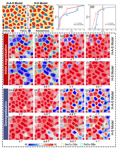 图1微磁学模拟不同结构的结果:(a)H-A-S模型和(b)H-S模型;(c)两种模型的初始磁化曲线;(d)两种模型的退磁曲线;(e-h)H-A-S模型的初始磁化过程;(i-1)H-S模型的初始磁化过程;(m-p)H-A-S模型的退磁过程;(q-t)H-S模型的退磁过程。