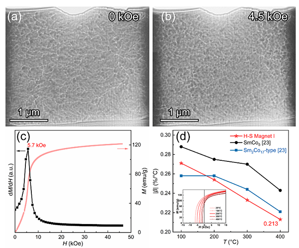 图5原位磁畴观测直接验证交换耦合增强机制。为了从实验上直接观测磁畴行为并验证模拟预测,研究团队对磁体I进行了原位洛伦兹透射电镜观测。图5(a-b)清晰地展示了在低外磁场下,磁体I的磁畴壁移动受到限制,磁畴结构更加稳定,表明软磁相被有效“硬化”,反向磁畴的形核与扩展受到更强抑制。这一直观的实验现象与微磁模拟的结果(图1)以及Henkel曲线分析(图4)完全吻合,三重证据共同锁定了“增强的交换耦合作用是矫顽力提升的根本原因”这一核心机制,为整个研究提供了坚实的实验证据。此外,该纳米复合磁体还拥有低于商业SmCo磁体的矫顽力温度系数(−0.213 %/◦C),也表明其在高温应用中的潜力。