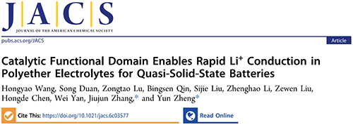 文章信息:H. Wang, S. Duan, Z. Lu, B. Qin, S. Liu, Z. Li, Z. Liu, H. Chen, W. Yan, J. Zhang*, Y. Zheng*, Catalytic Functional Domain Enables Rapid Li+ Conduction in Polyether Electrolytes for Quasi-Solid-State Batteries, Journal of the American Chemical Society, 2026, https://doi.org/10.1021/jacs.6c03577.