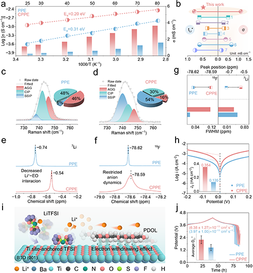 作者进一步对CPPE的电化学性能及离子传输行为进行了系统表征。拉曼光谱结果表明,“催化功能域”中引入的具有弱路易斯酸性和高介电特性的Ti4+位点可有效促进锂盐解离,从而提高体系中自由Li⁺浓度。进一步结合核磁共振分析,7Li NMR结果显示Li+与聚醚链段中EO基团的配位作用明显减弱,而19F NMR结果则表明TFSI⁻阴离子运动受到有效限制。上述结果共同证明该策略实现了“解离−传输”的协同调控,从而使CPPE展现出优异的Li+导电性,室温下离子导电率达到1.14 mS cm−1,Li+迁移数高达0.77。