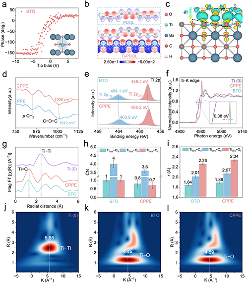 作者通过表面静电势和差分电荷密度模拟表明,在PDOL基电解质中引入Ti4+基材料可有效削弱EO的电子云密度。进一步结合傅里叶变换红外光谱(FT-IR)、X射线光电子能谱(XPS)及同步辐射技术对CPPE进行深入表征,证实了Ge4+与PDOL中醚氧(EO)之间存在吸电子效应。具体而言,Ti4+位点一方面削弱了Li+与EO之间的强配位,另一方面与EO形成了弱配位结构,加速Li+迁移过程,从而协同提升离子传输效率。该研究从分子模拟与实验表征两方面,为“催化功能域”策略提供了坚实的理论与实验证据。