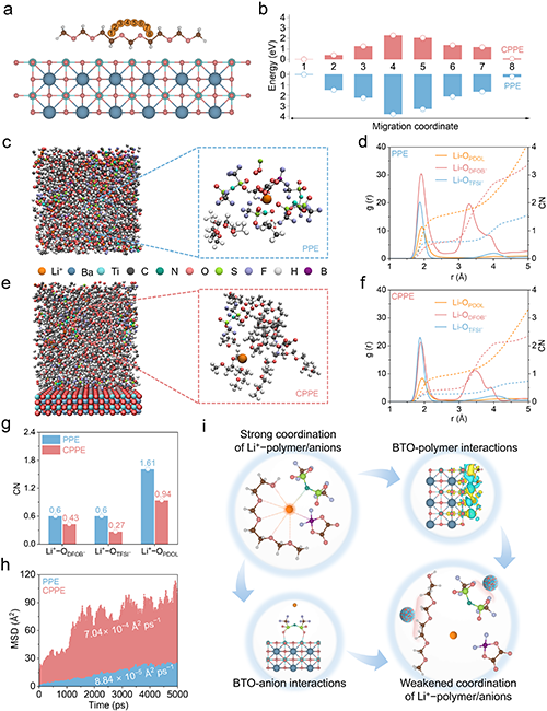 为进一步揭示CPPE中Li+快速传导的内在机理,作者结合密度泛函理论(DFT)与分子动力学(MD)模拟开展了系统研究。DFT结果表明,相较于对比体系PPE,CPPE中Li+在相邻EO位点间的迁移能垒显著降低(由3.79 eV降至2.29 eV),说明“催化功能域”通过Ti4+位点调控配位环境,有效削弱了Li+−聚合物相互作用,从而降低迁移阻力。进一步的MD模拟显示,CPPE中Li+与阴离子及聚合物链的配位作用均明显减弱;同时,Li+扩散系数较PPE提升近一个数量级。上述理论结果从原子尺度验证了CFD策略对“解离−传输”悖论的协同调控作用,并为实验中观察到的高离子电导率提供了理论依据。