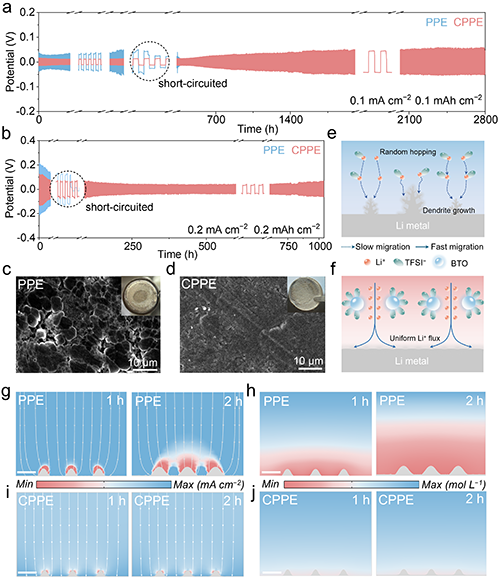 图5. Li|CPPE|Li对称电池在25 ℃下的电化学性能以及锂金属负极界面锂枝晶行为