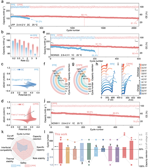 图7. Li|CPPE|LFP和LiCPPE|NCM全电池在25℃下的电化学性能