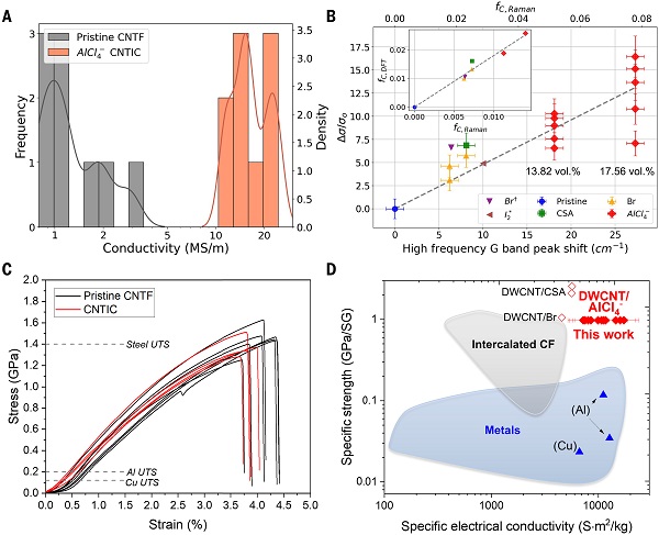 基于此,西班牙马德里高等材料研究所J. J. Vilatela教授团队在Science上发表了题为“Intercalated carbon nanotube fibers with high specific electrical conductivity”的论文,报道了一种“插层”技术,通过将强效掺杂物“四氯铝酸根离子(AlCl4–)”有序插入高取向度双壁碳纳米管(DWCNT)纤维的管间通道,使之在纤维内部均匀扩散并形成碳纳米管插层化合物。AlCl4–作为非共价掺杂物,每个离子从碳管外层接收0.65个电子,结合其17%的体积分数,成功将纤维的室温导电率推高至24.5 MS/m,达到铜的41%。材料的比导电率更是高达17345 S·m2/kg,优于铜和铝,意味着同等重量下能承载更多电流。同时,该纤维兼具优异的轻质高强特性,强度为传统架空电缆的五倍,而重量仅为其一半。在稳定性方面,该材料在干燥条件下性能保持如初,经聚合物护套封装防潮后,仍可保留80%的导电率。该研究实现了碳纳米管宏观纤维在导电性、轻量化和强度上的协同突破,是轻量化导电材料领域的重要进展。