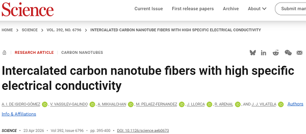 原文详情:Intercalated carbon nanotube fibers with high specific electrical conductivity (Science 2026, 392, 395-400)