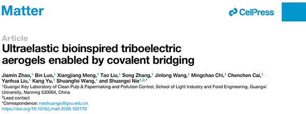 近日,王双飞院士团队受跳蚤弹性蛋白垫取向层级结构的启发,提出一种共价桥接协同纤维流剪切的策略,以同时提高气凝胶在极限应变下的弹性和耐疲劳性。基于该策略制备的摩擦电气凝胶,经历99%的压缩应变后可恢复性高于95%,且在90%的压缩应变下能承受20,000次的循环,是目前所有报道中最好的弹性材料之一。以此开发的摩擦电裂纹传感器表现出超快响应(68 ms),并且在超过10,000次循环中保持稳定的电信号响应。这项成果以题为“Ultraelastic bioinspired triboelectric aerogels enabled by covalent bridging”发表在国际学术期刊《Matter》上。2023级博士研究生赵佳敏为本研究的第一作者,聂双喜教授为通讯作者,罗斌、蒙香江、刘涛、张松、王金龙、迟明超、蔡晨晨、刘艳华、于康等参与研究,广西大学为唯一完成单位。