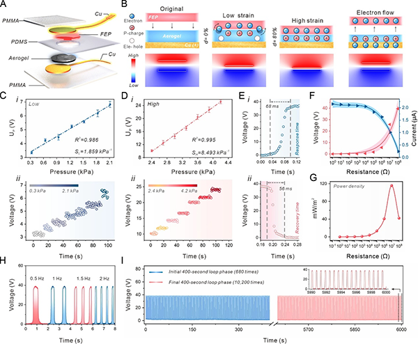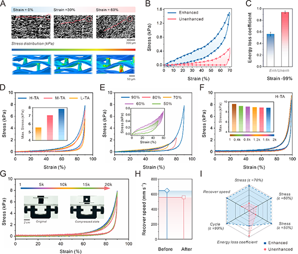 通过对摩擦电气凝胶机械特性的测试,可以分析其仿生结构与性能之间的关联。原位扫描电子显微镜与有限元分析结合,直观地显示出气凝胶在压缩-释放循环过程中片层及其微观结构的变化。循环压缩测试结果表明,摩擦电气凝胶经历99%的压缩应变后可恢复性高于95%,且在90%的应变下能承受20,000次的循环压缩。