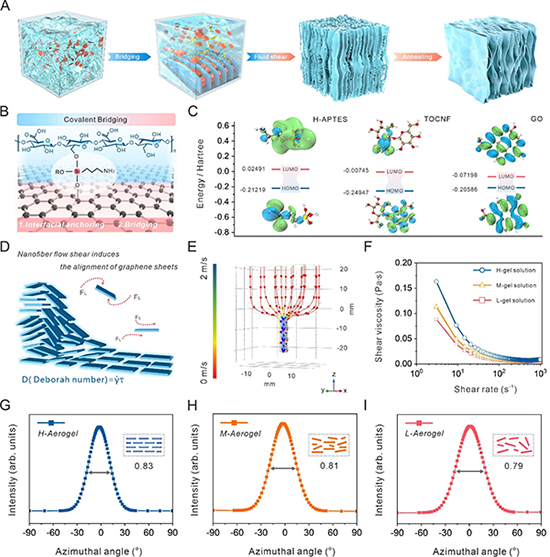将三氨基丙基三乙氧基硅烷(APTES)共价接枝在无序的TEMPO氧化纳米纤维素纤维(TOCNF)上,接着通过同样的缩合反应桥接氧化石墨烯纳米片,以此在两者之间形成稳定的“共价键桥梁”。随后,纳米纤维素在流体剪切力的作用下发生流动。根据流变学的经典理论研究,在外力作用下假塑性流体流动时,散乱的链状分子因受到层流的剪切力作用,构象被迫发生改变,发生剪切稀化行为。这种剪切力往往会使聚合物链沿着流动方向对齐,体系的构象熵减小,黏度降低。实验结果表明,该气凝胶前驱液符合经典假塑性流体的流变特性,纤维素纳米纤维在流体剪切过程中可以通过“共价桥梁”诱导氧化石墨烯纳米片实现对齐。