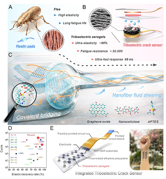 自然界中,跳蚤展现出了令人惊叹的运动能力,其垂直跳跃高度可达自身身体长度的数百倍。这一卓越运动性能,是依赖于后腿基部特有的弹性蛋白垫作为能量存储与释放单元。该弹性蛋白垫能够在高频、反复压缩—回弹循环过程中长期保持结构完整性而不发生疲劳失效。这一优异力学表现主要归功于其内部高度取向且具有层级分布的微观结构。该结构不仅有利于在动态载荷下实现应力的快速分散,还能够在大变形过程中有效抑制局部应力集中,从而确保跳蚤在数以万次的跳跃过程保持稳定。通过模仿跳蚤弹性蛋白垫的高取向层级结构,利用共价桥接协同纳米纤维流剪切策略,获得的仿生摩擦电气凝胶在超大应变条件下仍表现出近乎完全的弹性恢复能力和卓越的抗疲劳特性。