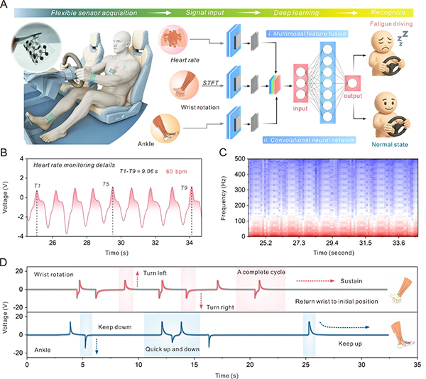 图5. 集成式摩擦电裂纹传感器用于驾驶疲劳预测。